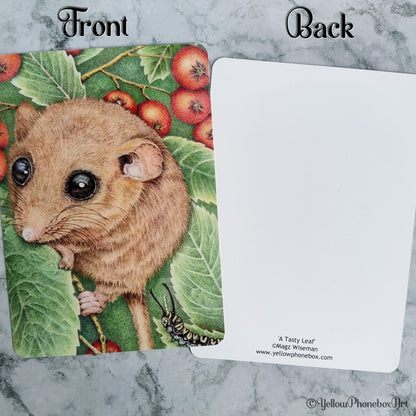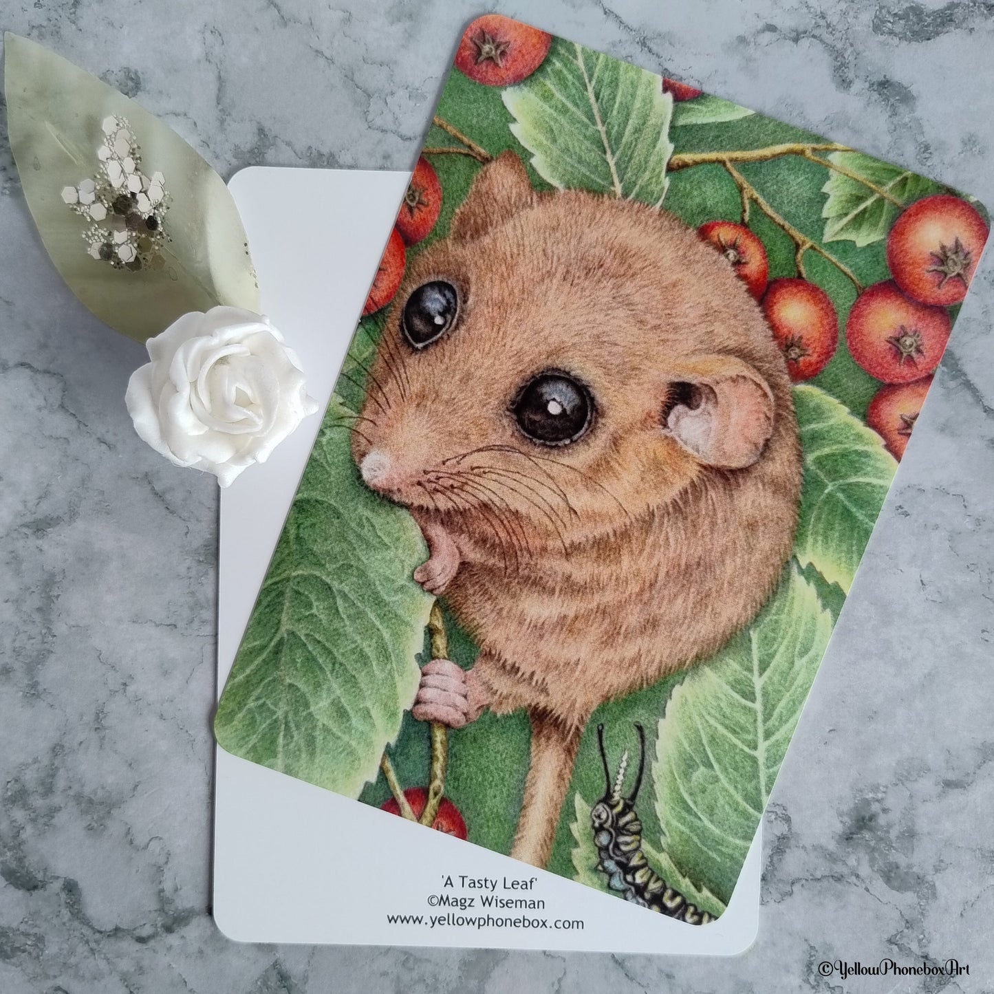 This cute postcard has been printed from my original colour pencil artwork, 'A Tasty Leaf' in which a cute little mouse munches happily on a tasty leaf amongst the berries. Do you think he’s noticed the strange little unicorn caterpillar watching?