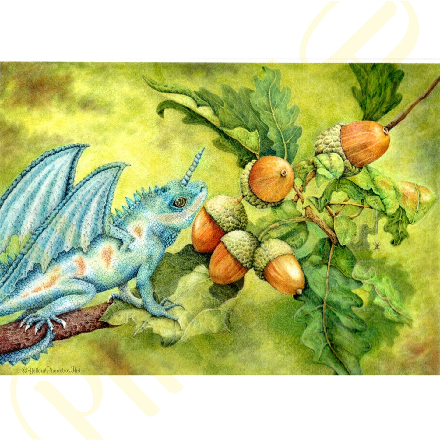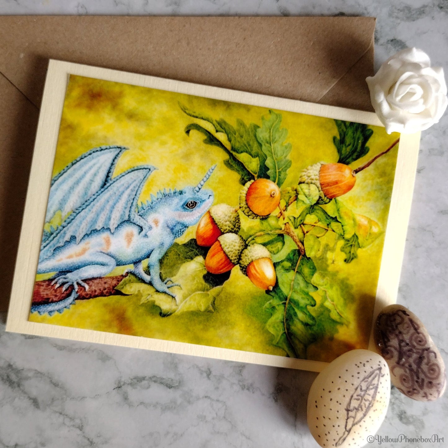 This handcrafted greetings card features a mini-print of my original artwork, 'Acorns' where a little blue Unicorn Dragon discovers the wonder of acorns while exploring an ancient oak tree.