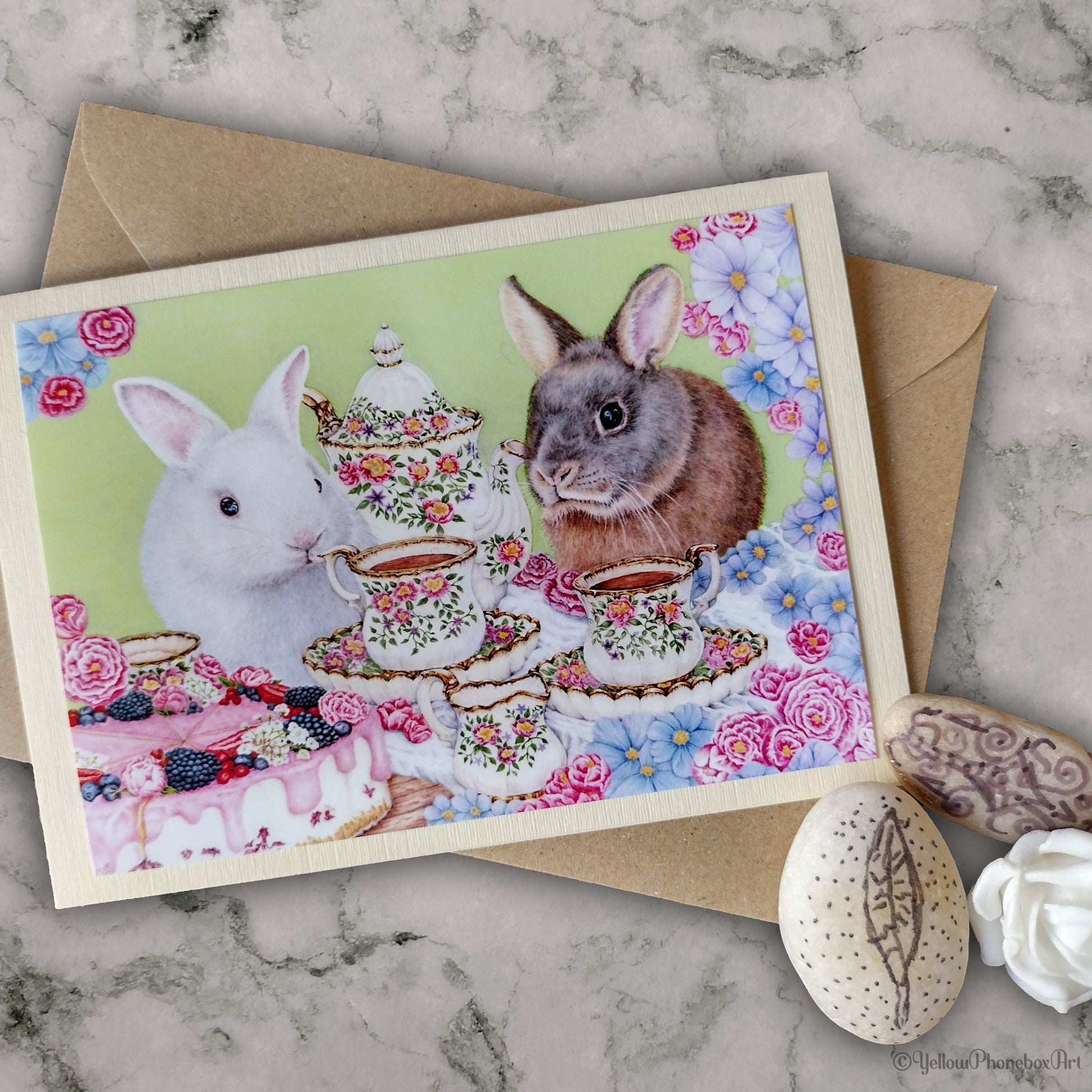 This handmade greetings card features a mini-print of my original artwork, ‘Afternoon Tea’ in which a couple of sweet bunnies wait for a special guest to join them for a delightful tea and cake picnic! It has a plain inner with a nice decorative edge for your own personal message.
