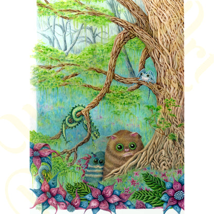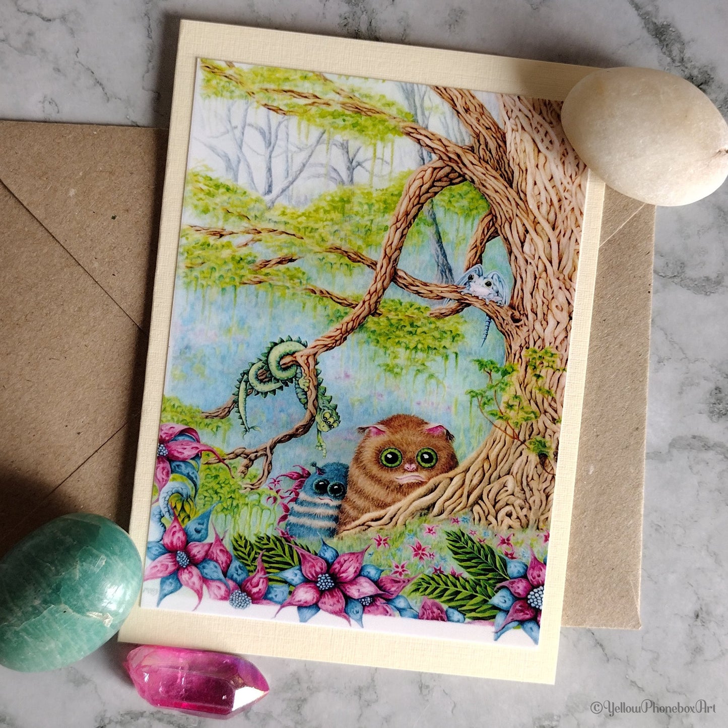 This handmade greetings card features a mini-print of my original artwork, 'Another Day In The Strange Forest'.