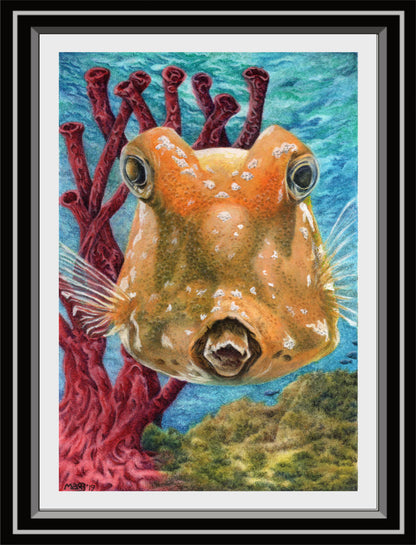 This is a print from my original mixed media painting, ‘Boxfish Are Cute Too!’ depicting a Boxfish chilling beside some coral after a refreshing morning swim.