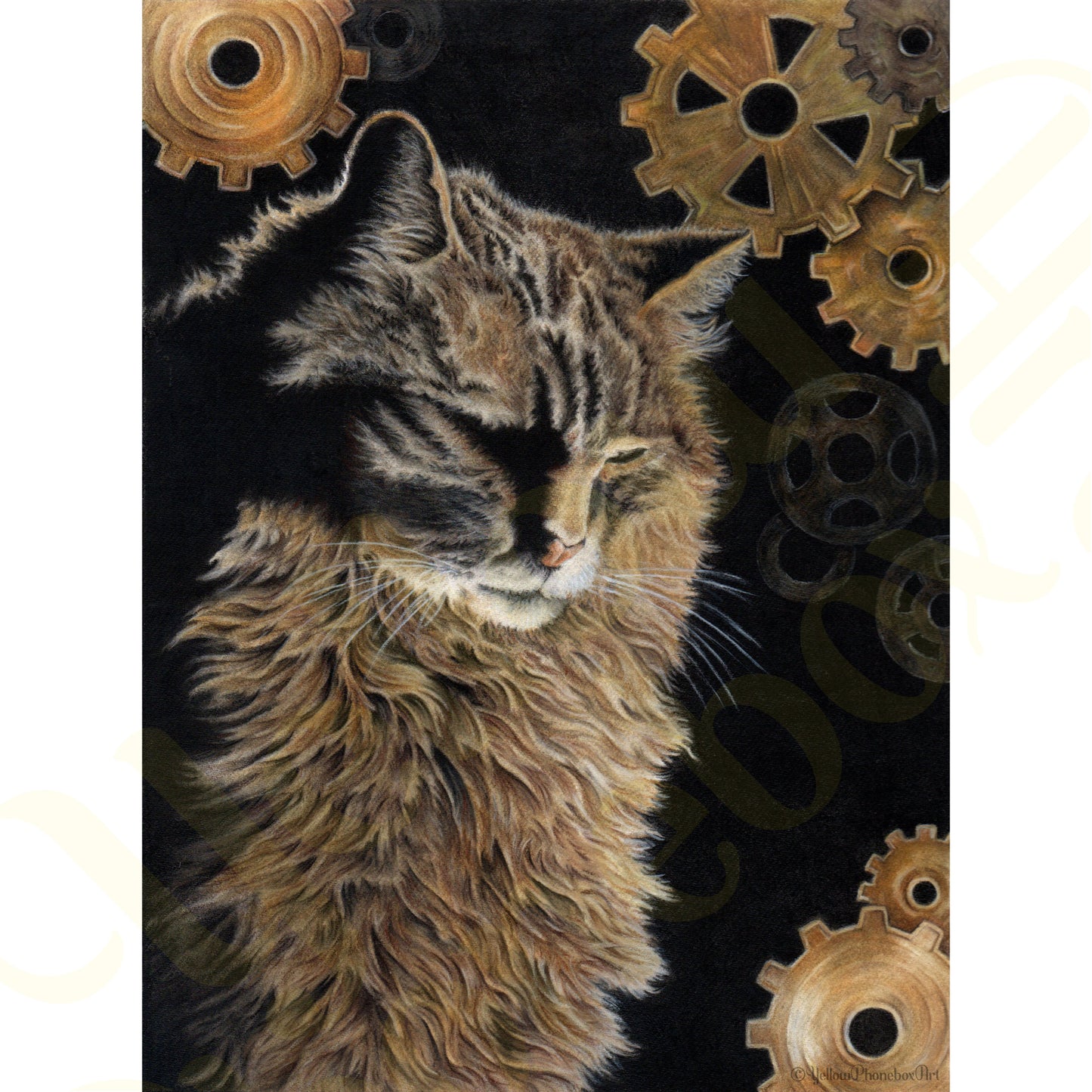 Do the cogs and gears represent the mysterious inner workings of the cat’s mind or is this kitty dreaming about a giant automated cat food can opening machine?