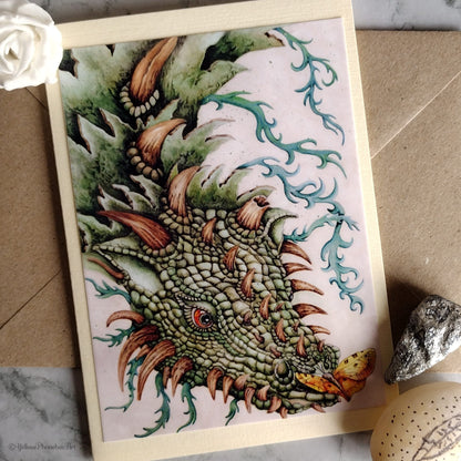 This handmade greetings card features a mini-print of my original artwork, 'Dragon Butterfly' where a battle hardened dragon meets a delicate, curious butterfly for the first time.
