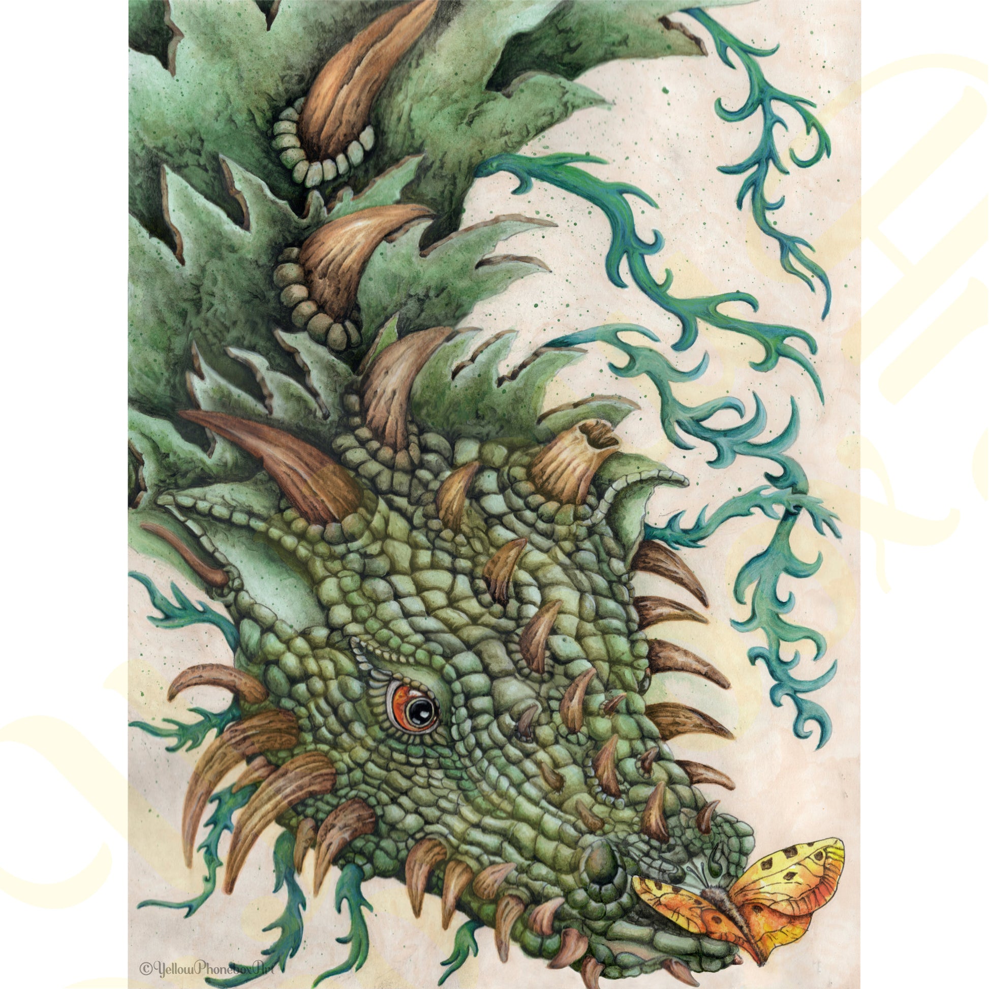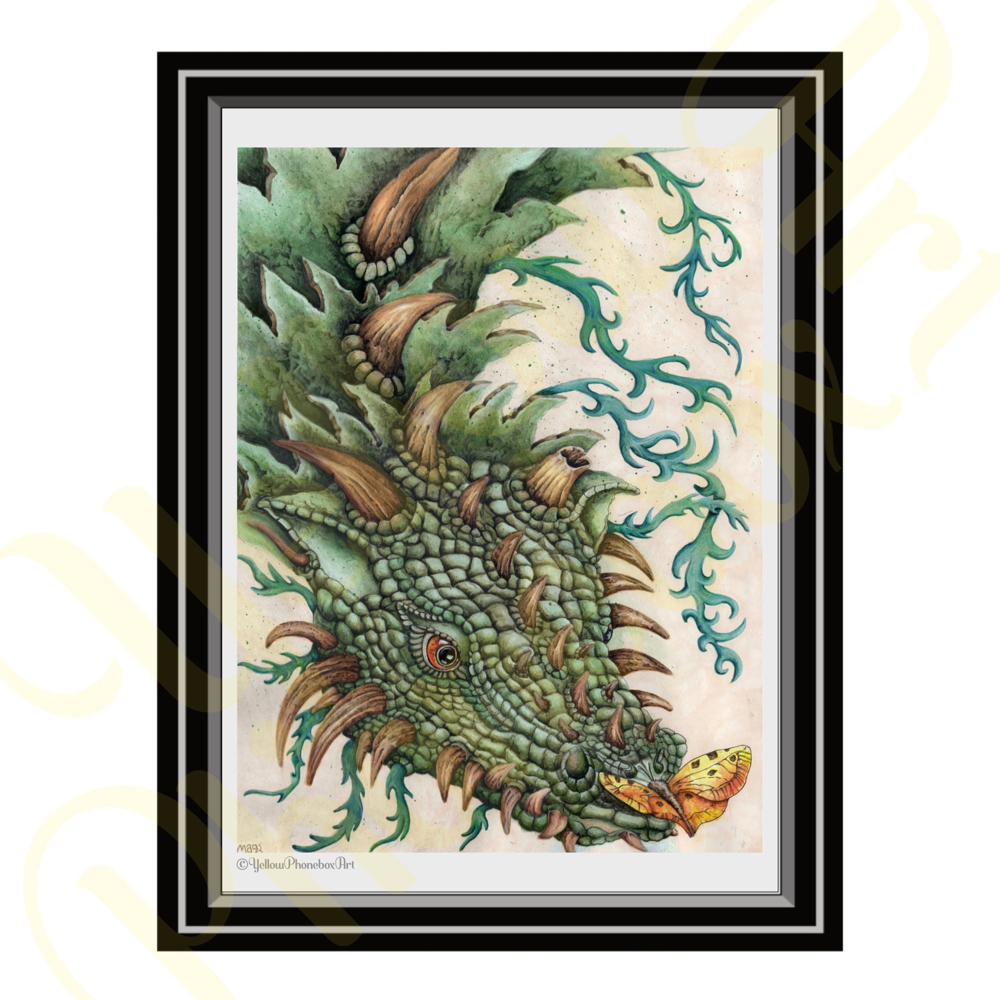 This is a print from my original mixed media painting, ‘Dragon Butterfly’ where a battle hardened dragon meets a delicate, curious butterfly for the first time.