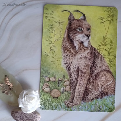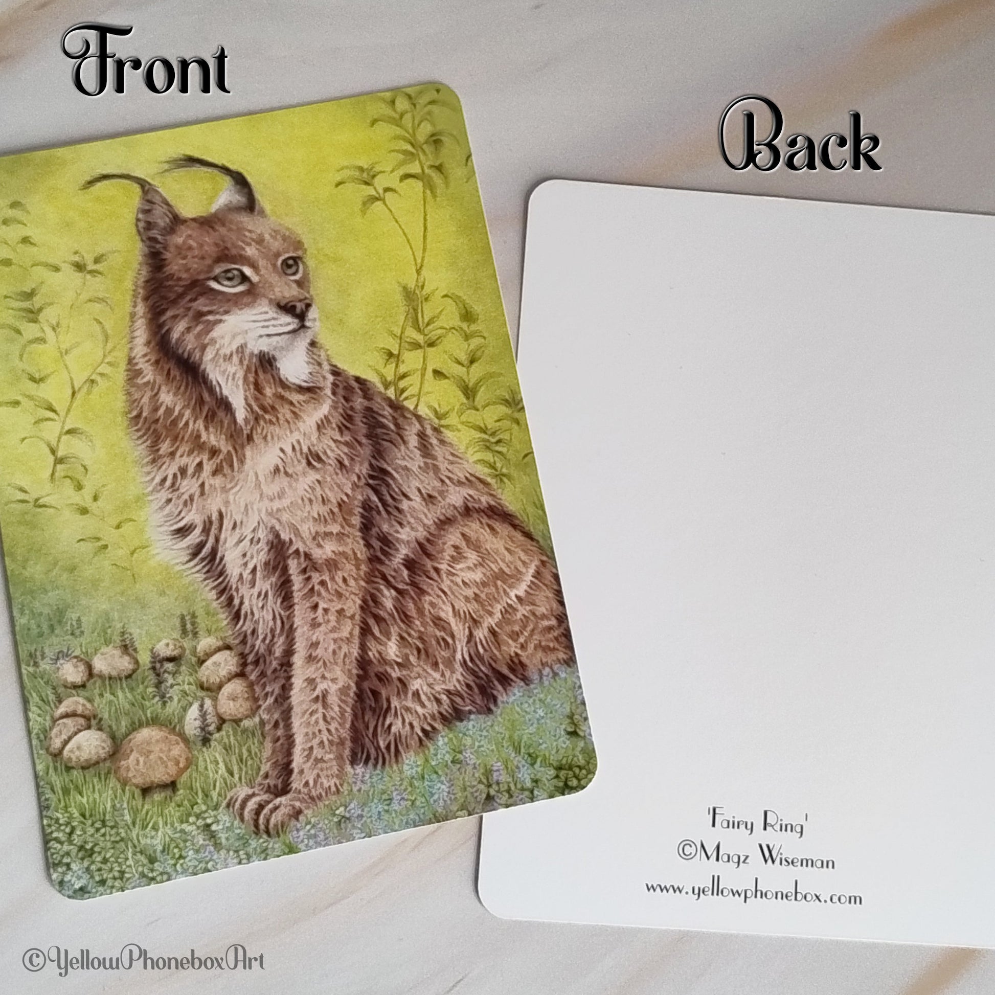 This A6 Postcard is from my original mixed media artwork, 'Fairy Ring’, where upon a remote hillside in the Scottish Highlands, a wild Lynx surveys her rugged lands. The Fairy watching from the magical mushroom ring again reminds the noble cat these lands be more Fairy than Feline. As always, they agree to disagree before pondering the many mysteries of life.