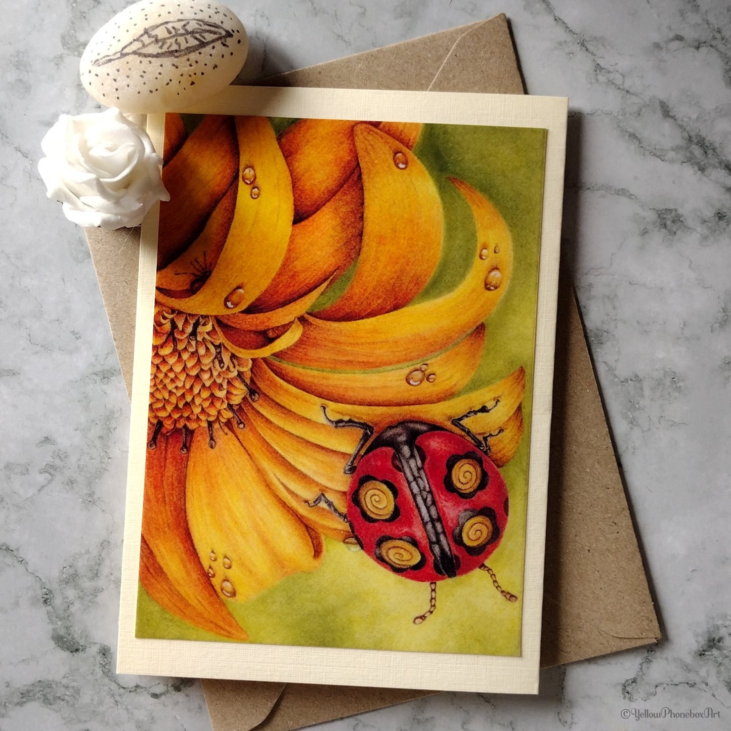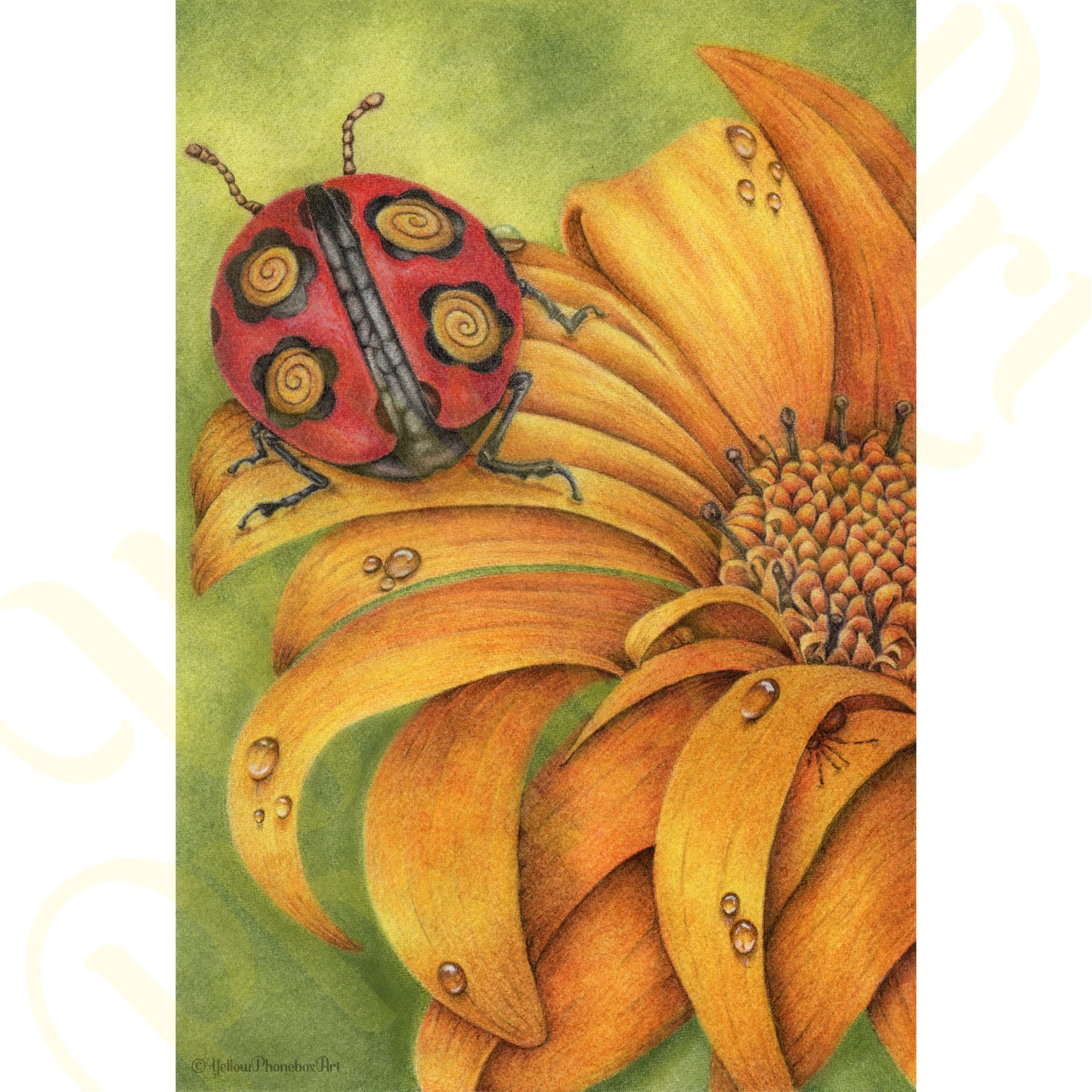This handmade greetings card features a mini-print of my original artwork, 'Hide and Seek' Sometimes a Ladybird just wants to play hide and seek with their best spider friend.