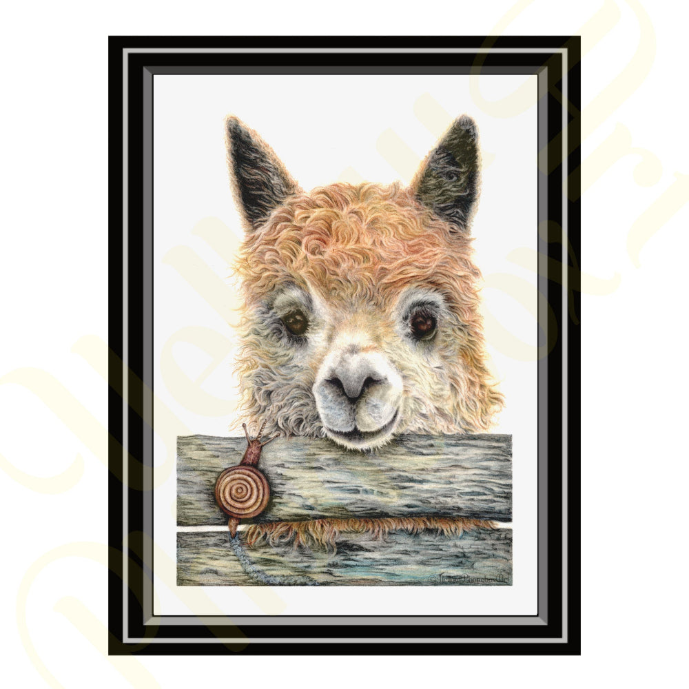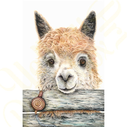 Unsure whether he's a Llama or an Alpaca, this Llampaca finds the appearance of a curious Unicorn Snail to be much more interesting than just gazing over a fence!