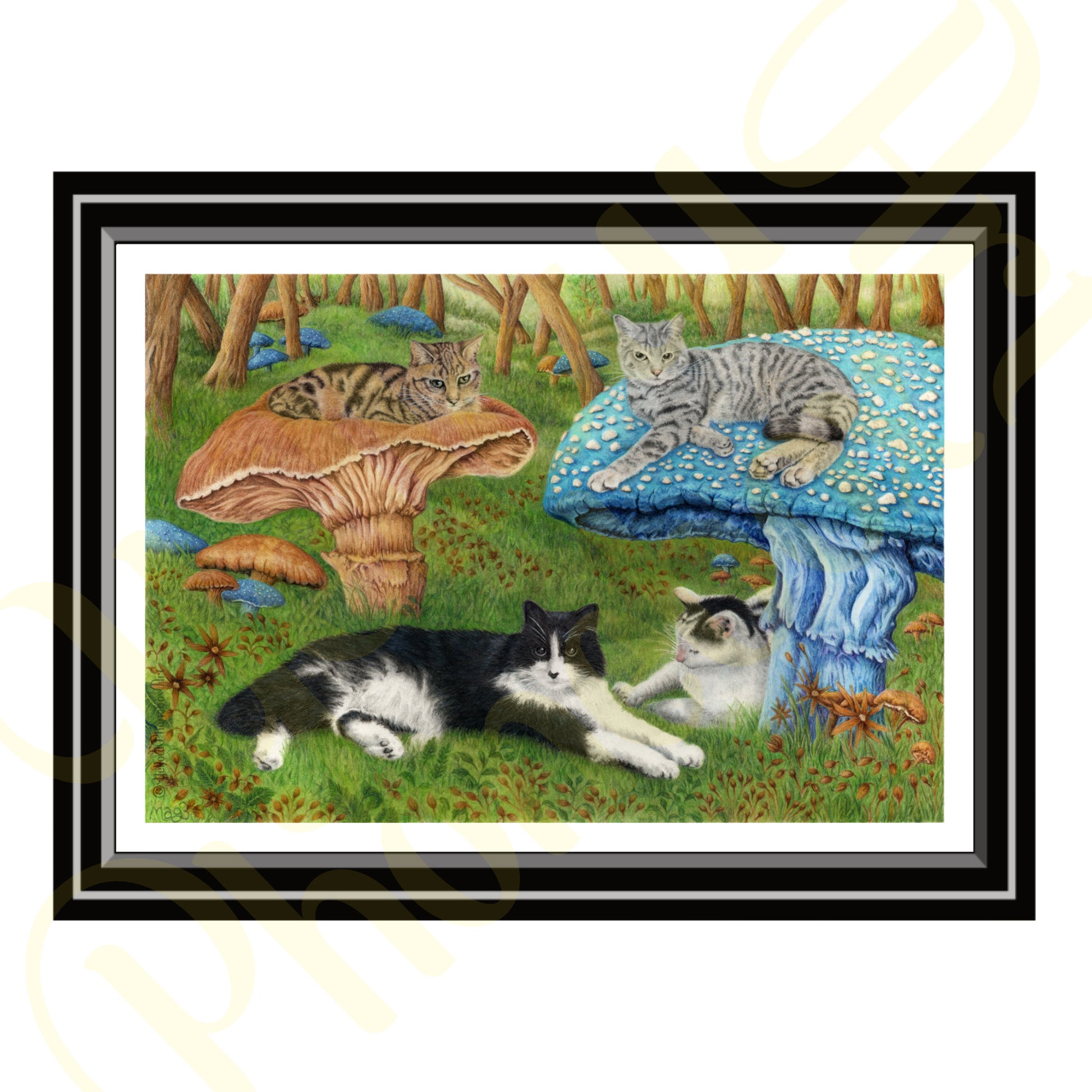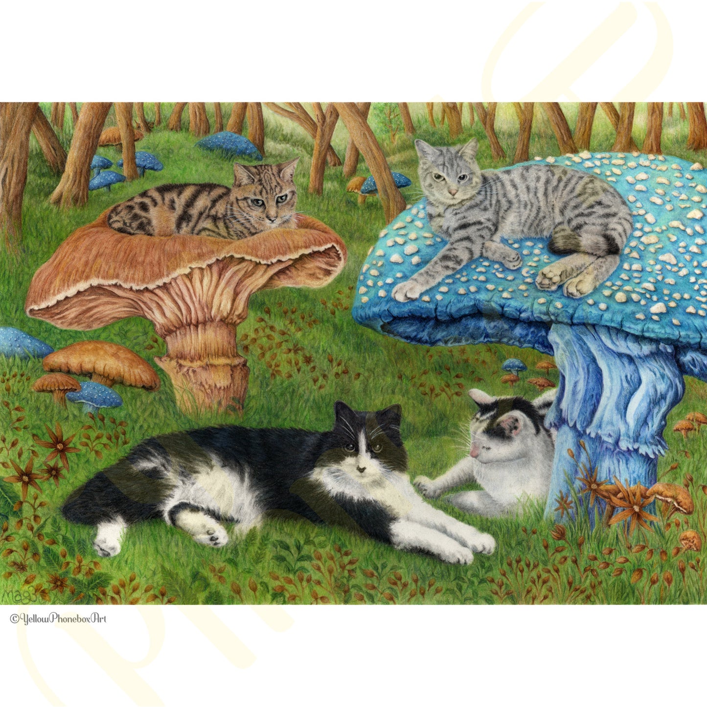 Four cats lounge upon some very comfy mushrooms doing what cats do best… relaxing!