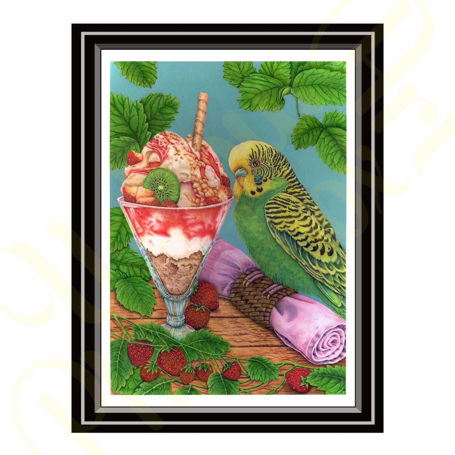 This print is from my original mixed media painting artwork, 'My Ice Cream!' in which a small budgie has every intention of eating an entire Ice Cream Sundae all by himself.