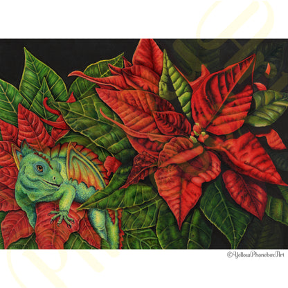 This handmade greetings card features a mini-print of my original artwork, 'Poinsettia Dragon' These special little dragons sprout from only the most special Poinsettia plants during winter and are extremely rare. If you happen to find one within the petals and leaves of your own Poinsettia, make sure to leave a small Christmas Pie in the pot and you will have the dragon’s friendship forever.