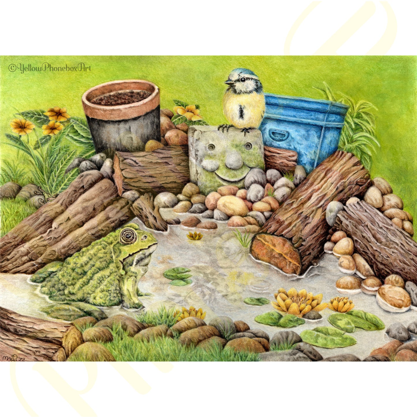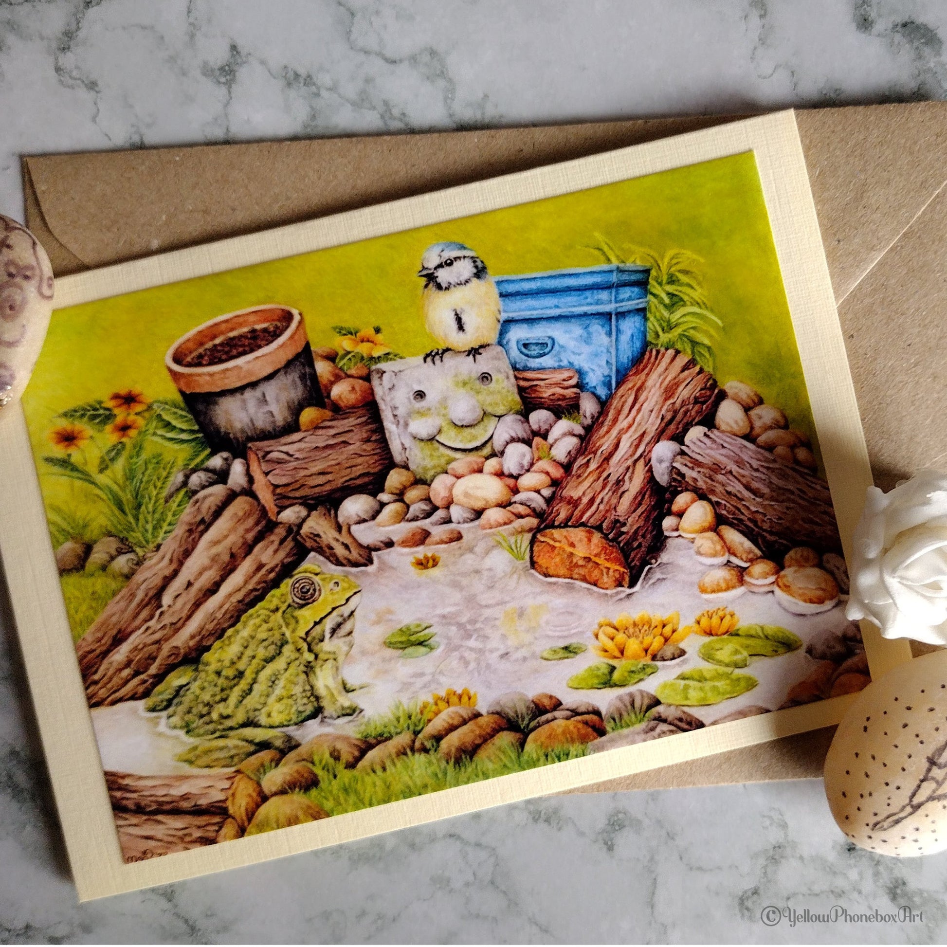 This handmade greetings card features a mini-print of my original artwork, 'Pondlife' It may be a simple garden pond, but it get’s a lot of visitors every day and night!