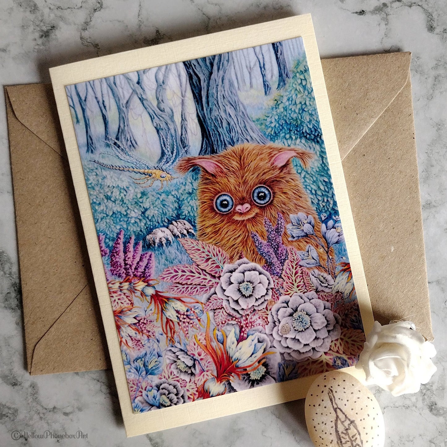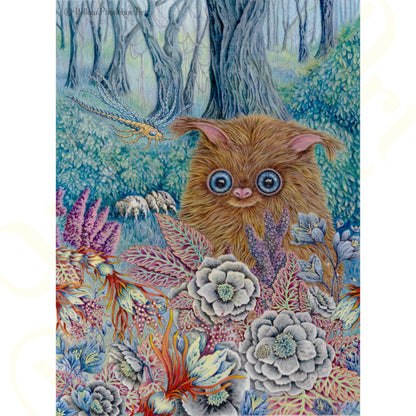 This handmade greetings card features a mini-print of my original artwork, 'Strange Forest'. The Strange Forest derived its name from the fact that it is a forest that is strange. Among the playful plants, walking rocks and bizarre insects, you’ll occasionally find a furry creature which spends most of the day pondering upon how strange and wonderful its forest home is!
