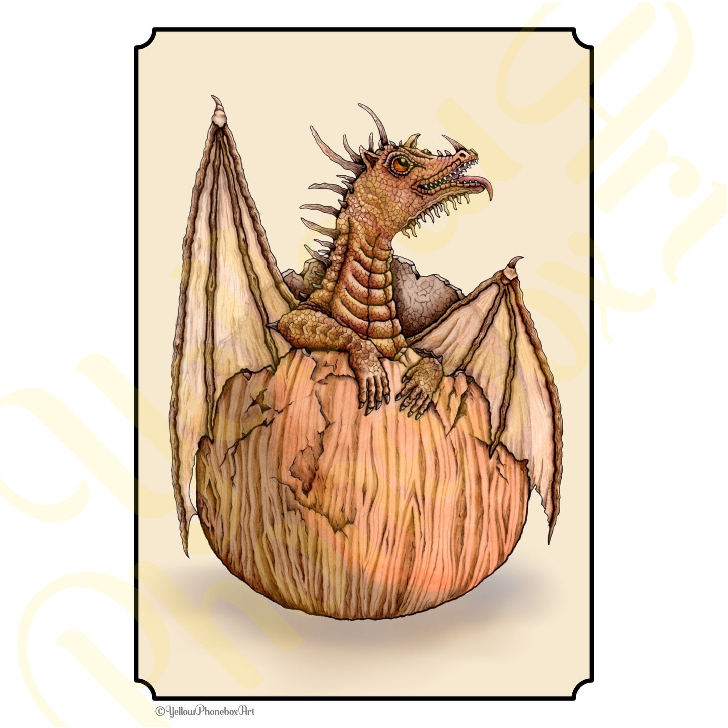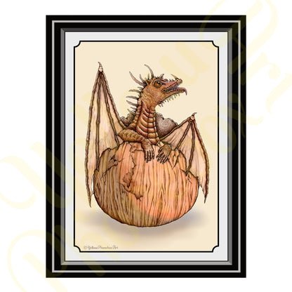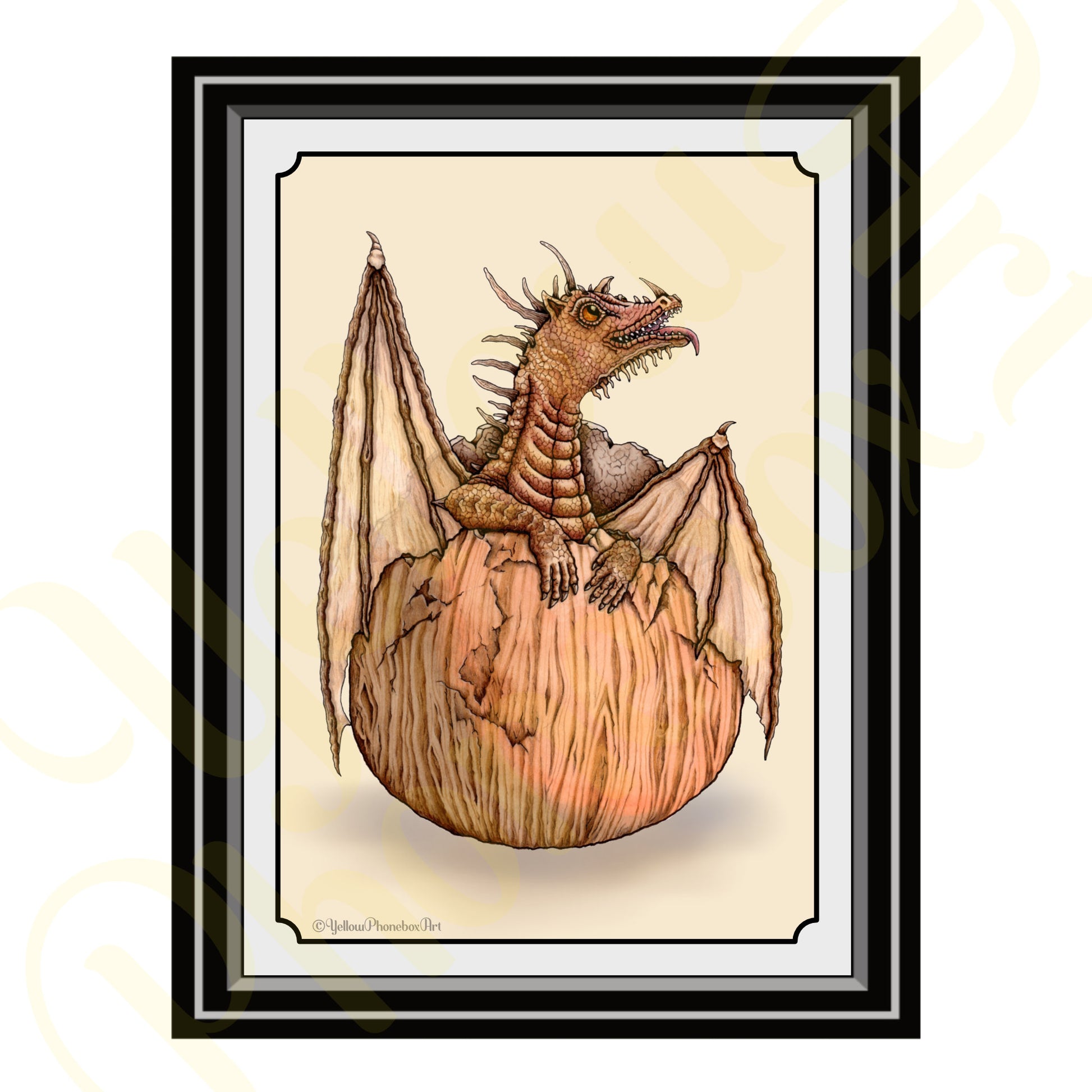 This is a print from my original mixed media (marker pen and colour pencil) illustration, ‘Wooden Hatchling’ in which a Wood Dragonlet joyfully bursts from its wooden egg, ready for a life of happy adventure.